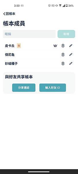 - 按「垃圾桶」可以刪除成員 (如果已經開始參與分帳就沒辦法刪除了)
