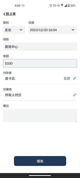 付款者預設是自己,分攤者預設是均分,一般情況下打完項目和金額就可以直接送出囉