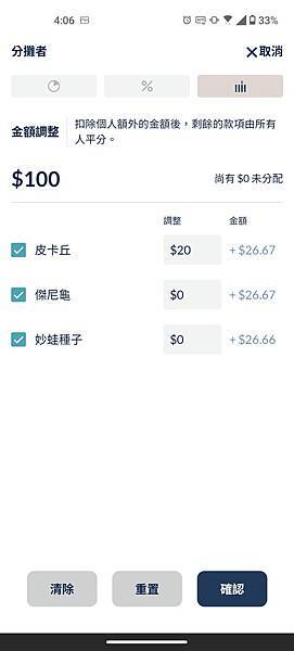 - 朋友甲多點了一個 $20 的飲料自己喝,可以設定「調整 $20」,其餘的金額均分