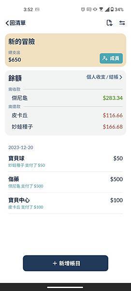 - 第二個區塊顯示餘額,墊錢墊比較多的在「需收款」、相對的則在「需還款」的清單中