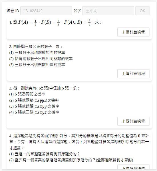 採用老師自製的線上考試系統,會隨學生需求進行版本更新,定期考試以確認大家的學習狀況並適當